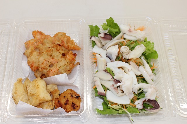 〈メニュー〉〇エソのすり身揚げ 〇エビのかき揚げ 〇イカの天ぷら 〇サラダ