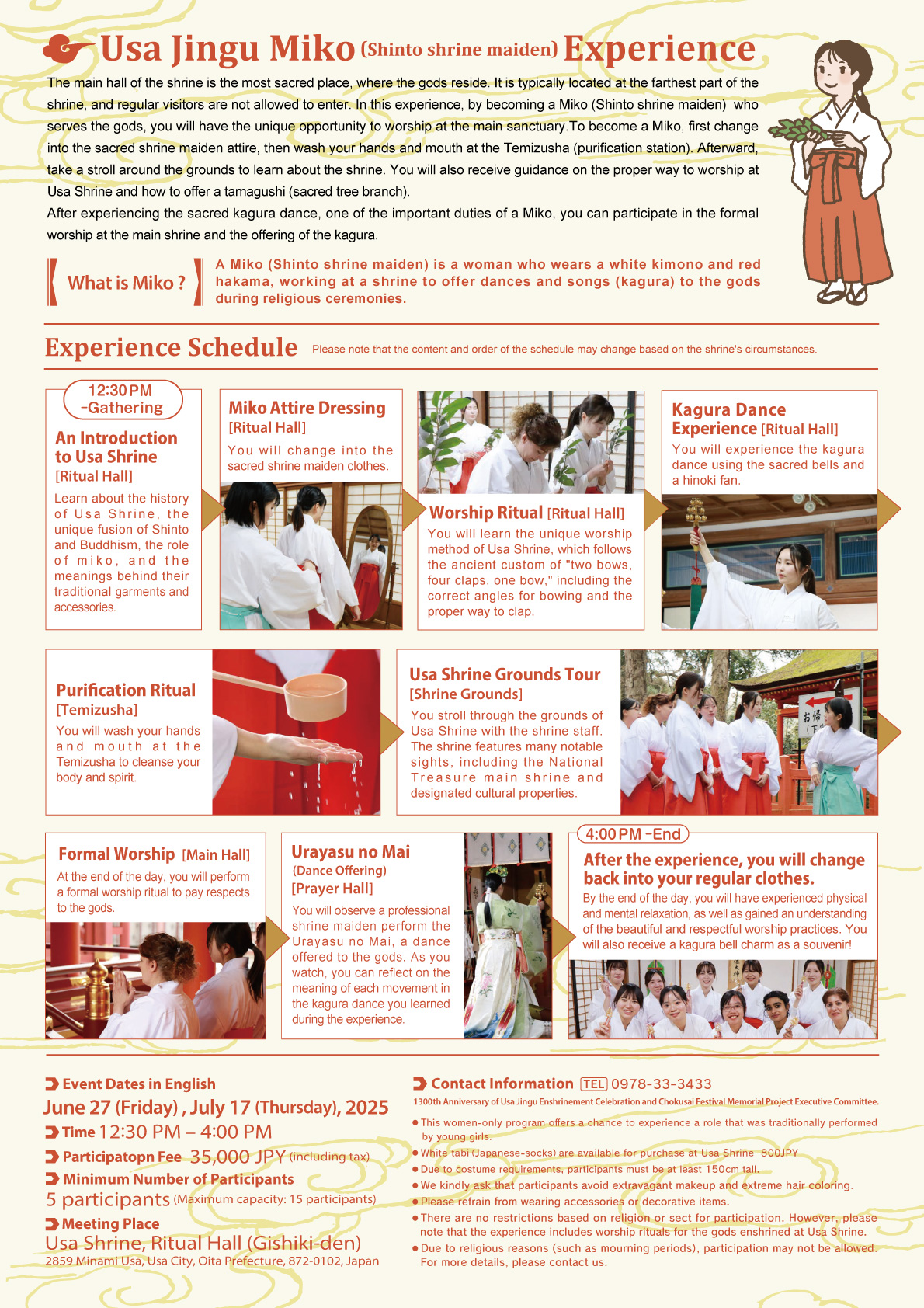- There are no restrictions based on religion or sect for participation. However, please note that the experience includes worship rituals for the gods enshrined at Usa Shrine.