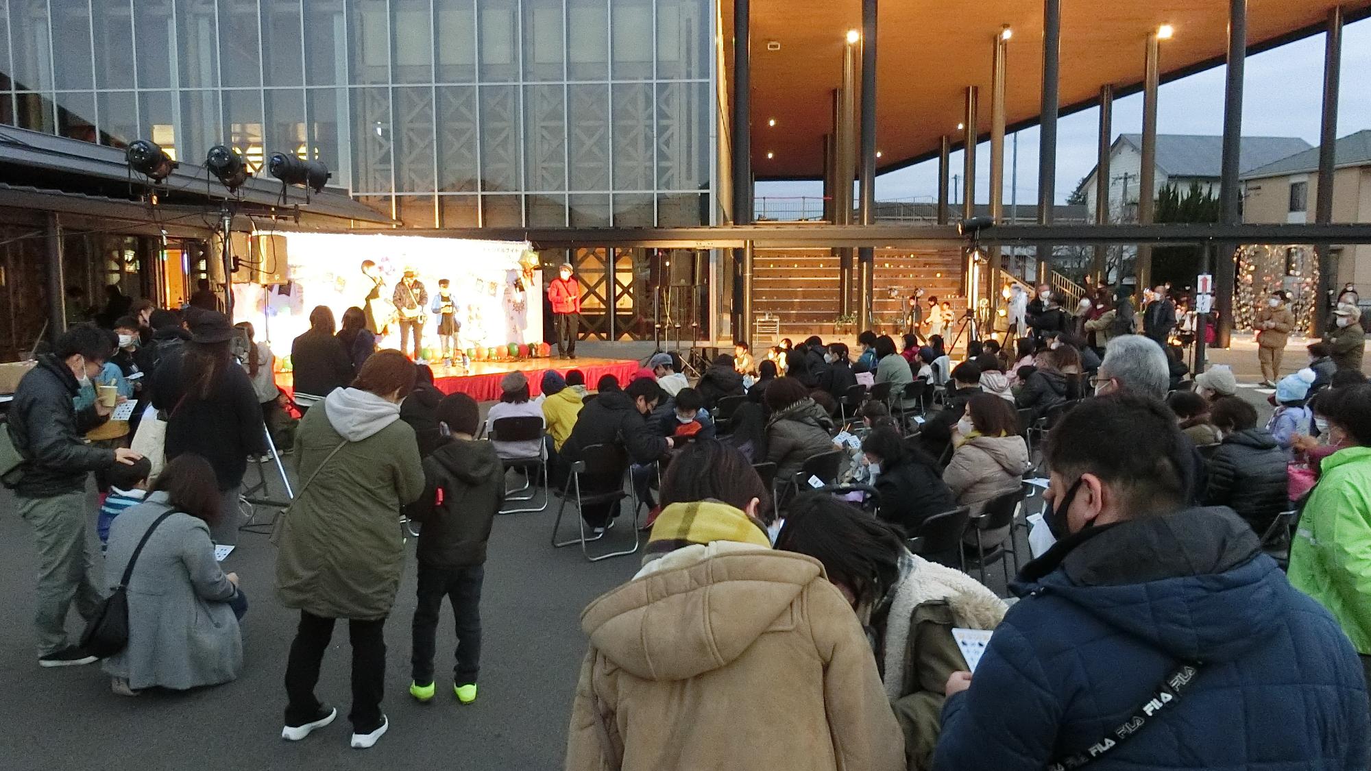 令和4年12月3日(土曜日)、安心院地域複合支所にて「あじむ灯りフェスタ」が開催されました。すっぽんくじやキッチンカーにたくさんの方が列を作る中、クリスマスにちなんだ音楽の演奏とともにイベントが開幕。バンドやゴスペルの生演奏やマジックショー、花火など多彩なプログラムで会場を賑わせました。