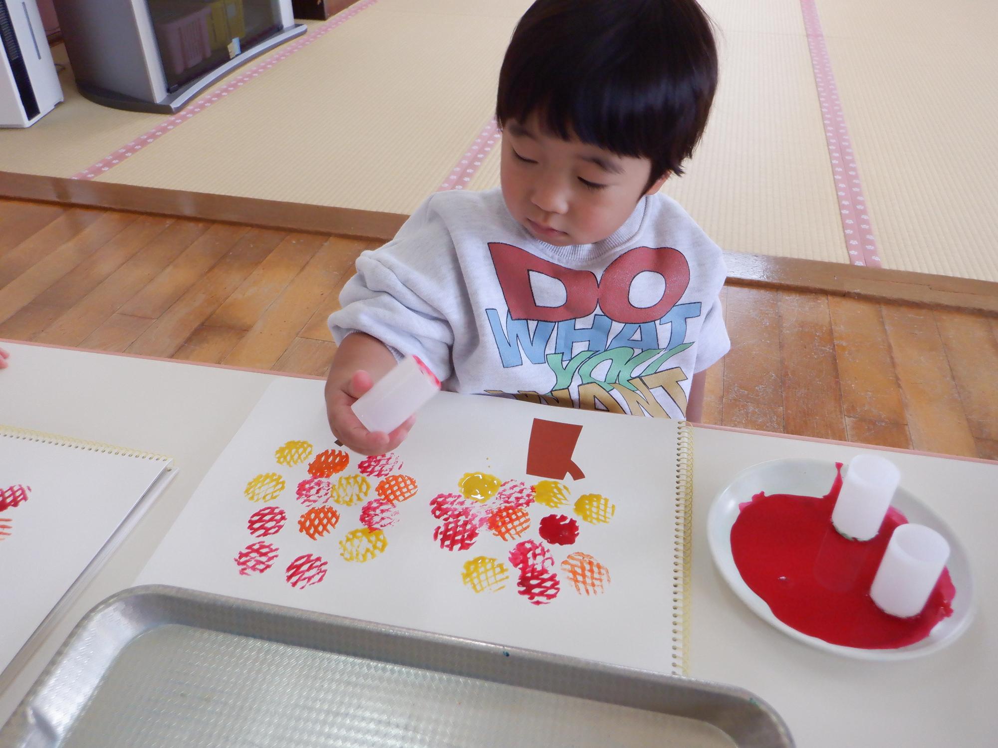 とっても真剣な眼差しでスタンピングを楽しんでいます。木にいっぱいの葉っぱつけるんだ!