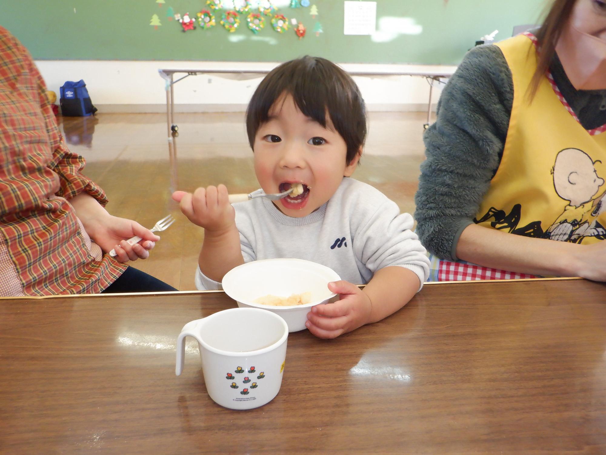 お餅最高!つきたての黄粉もち美味しいね。のどに詰まらないようにしっかり見守ります。