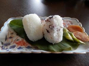| (右おにぎり)紅梅漬け、しその葉、キクイモの漬物、キクイモの漬物を混ぜ込んでいる | (左から)葛の花と玉ねぎのかき揚げ、ヨモギ、野アザミの葉 | (左から)ウド、ツユクサ、イヌビユ |