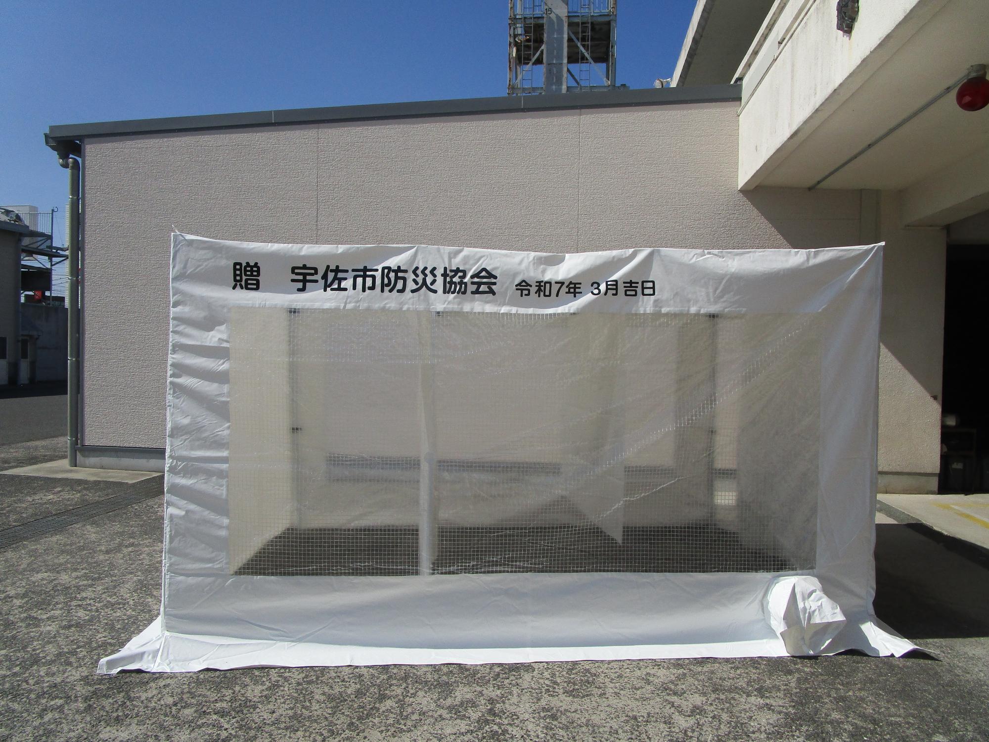令和7年3月19日(水曜日)に宇佐市役所第一応接室にて宇佐市防災協会より寄贈された煙体験テントの受納式が行われました。