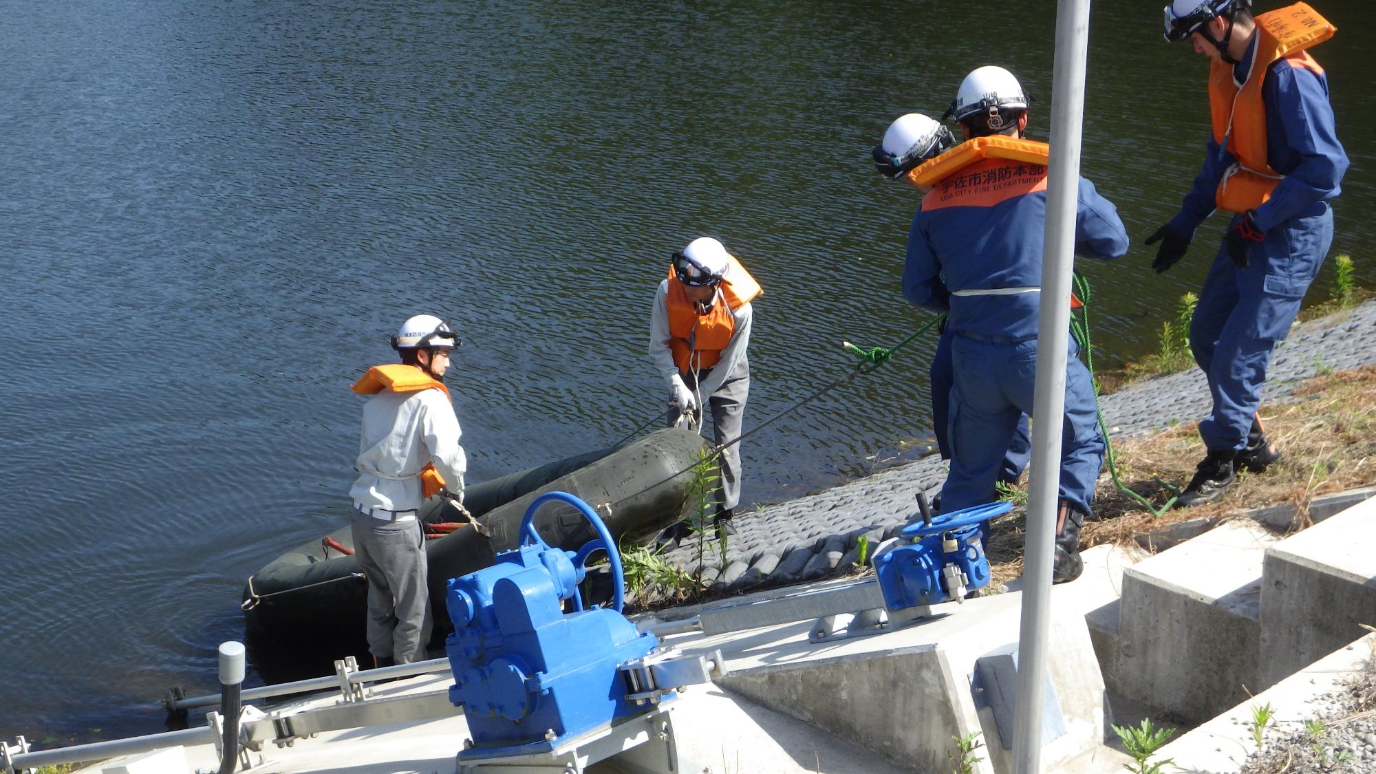 まず、救助ボートを池に浮かべます。隊員が連携し合い、ボートが流されないように確保したり、資器材を救助ボートに積み込んだりします。